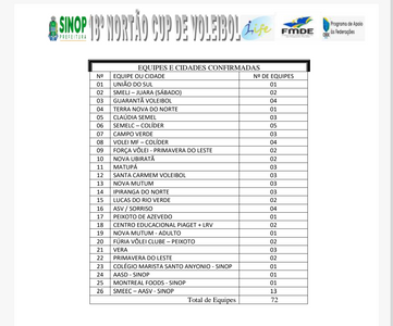 No total serão 72 equipes participando, com participação dos municípios de Sinop, União do Sul, Terra Nova, Guarantã do Norte, Colíder, Sorriso, Campo Verde, Primavera do Leste, Nova Ubiratan, Vera, Santa Carmen, Nova Mutum, Ipiranga do Norte, Claudia, Lucas do Rio Verde, Juarez, Matupá e Peixoto de Azevedo.